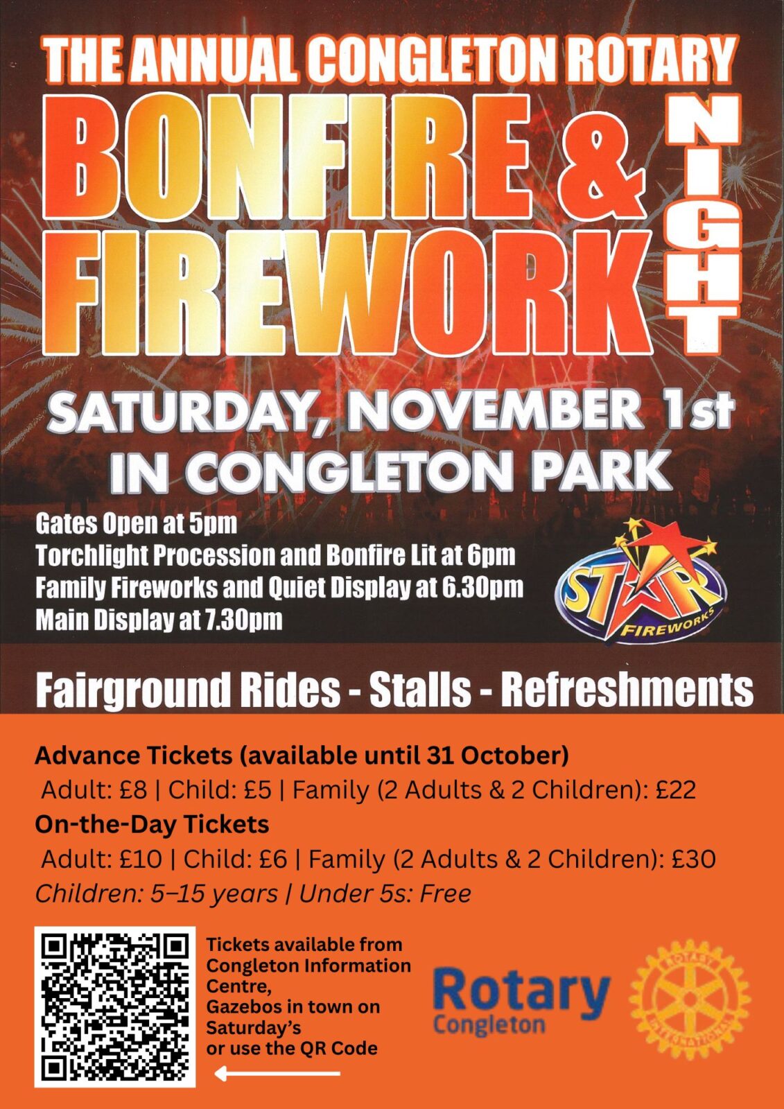 ![]() Rotary Congleton present their annual Bonfire & Firework Night 5pm – Gates Open 6pm – Torchlight Procession & Lighting of the Bonfire As in previous years, there will be two shows.. 6.30pm - One for the younger members of the family (silent fireworks) 7.30pm - The ‘grown-ups’ show with bigger and noisier fireworks. Fairground rides, … Read more of this article |