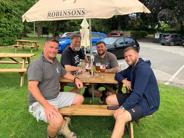 White Ribbon Ambassador Mike Wesley (2nd from left) chats to building contractors the Stradling Brothers, who were happy to make the White Ribbon Promise with their Friday pint.